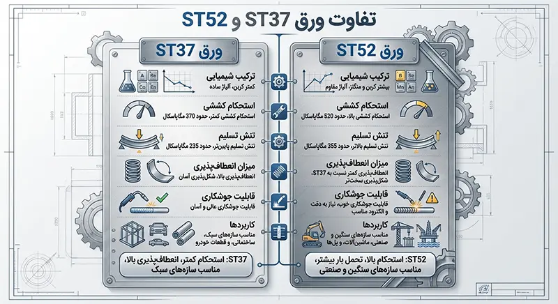 «تفاوت اصلی بین ورقهای فولادی ST37 و ST52 در میزان کربن و حد تسلیم آنهاست. ورق ST52 دارای درصد کربن بالاتری بوده و در مقایسه با ST37 از استحکام بهمراتب بیشتری برخوردار است؛ موضوعی که بهطور مستقیم بر قابلیت جوشکاری، چقرمگی و عملکرد سازهای این فولادها تأثیر میگذارد.»