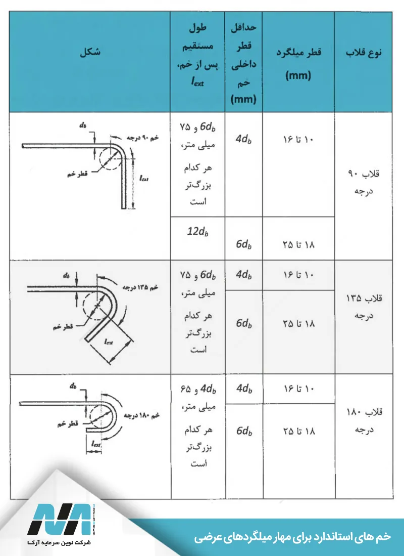 | نوع خم میلگرد | شکل ظاهری | محل استفاده رایج | نقش سازهای / اجرایی |